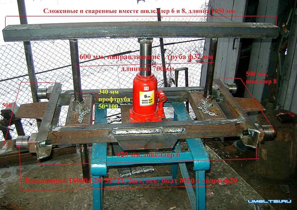 Длина – 500 мм, ширина между краями поперечных балок – 820 мм. Расстояние между швеллером №6, где заходит труба – 340 мм. Расстояние между направляющими – 600 мм. Длина самих направляющих – 700 мм, для их изготовления взята 32 труба. Подъемная балка выполнена в виде своеобразной профильной трубы, которая сваренная из швеллеров №8 и №6 – они вставлены один в другой. Длина балки составляет 1050 мм.