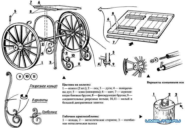 Площадкой для цветочных емкостей (ящиков или горшков) будет служить деревянный щит, сколоченный из дощечек и брусков так, что благодаря расположенным снизу брускам не потребуется какого-то специального крепления к колесной паре: щит фиксированно ляжет на ось и поперечины опорных дуг. Несмотря на то, что последние — металлические, можно обойтись без сварочных работ.