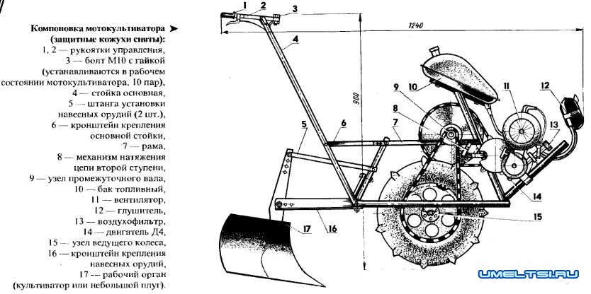Мотокультиватор собран на сварной раме, где установлены двигатель с системой воздушного охлаждения, глушителем, воздухофильтром и стартерпмюг бензопилы «Дружба», топливНЫЙ бак, промежуточный вал двухступенчатой цепной переда-чи, ведущее колесо, кронштейн длп навесных орудий.