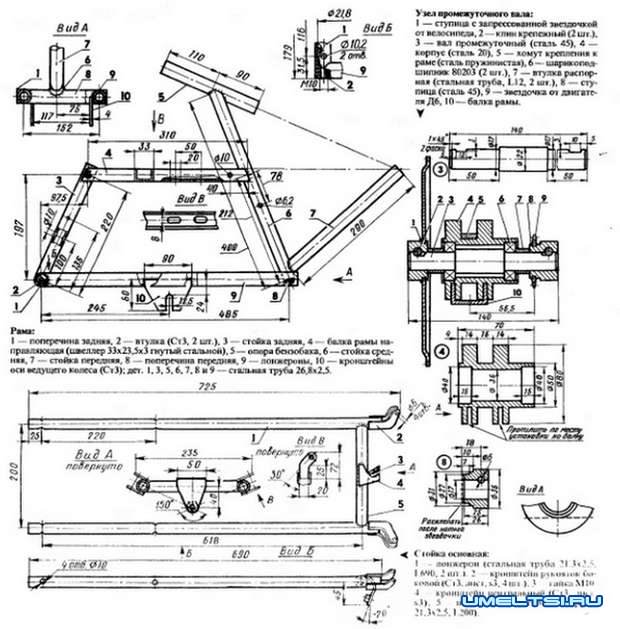 Цепи — велосипедные, но если есть возможность, лучше их заменить на более прочные. Например, от мопеда или мотоциклов «'Минск», «Восход» (шаг у этих цепей одинаковый).