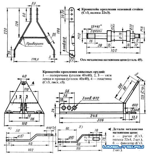 Нет проблем с хранением и транспортировкой, поскольку мотокультиватор складывающийся. Надо прежде всего отвернуть верхний болт М10 {см. схему расположения узлов и деталей) и сложить ручки управления вдоль верхней стойки. Затем, отвинтив пару гаек и вынув соответствующий болт из кронштейна крепления основной стойки с рамой, повернуть кронштейн и, наклонив стойку вперед до упора в швеллерную поперечину рамы, перейти к следующим двум элементарным операциям: отсоединению кронштейна крепления навесных орудий {отвернуть снизу три болта) и снятию ведущего колеса. Ослабив натяжение, можно снять и цепь, соединяющую ведущее колесо с промежуточным валом двухступенчатой передачи, а потом, чуть отвинтив гайки, крепящие ось ведущего колеса, высвободить его из пазов. Перевод мотокультиватора в рабочее состояние — в обратной последовательности.