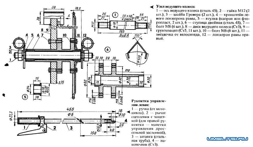 Система охлаждения — принудительная, с самодельным вентилятором. Запуск — стартером от мотопилы «Дружба-. Трансмиссия —двухступенчатая, цепная (it=4,36; i =4,8).