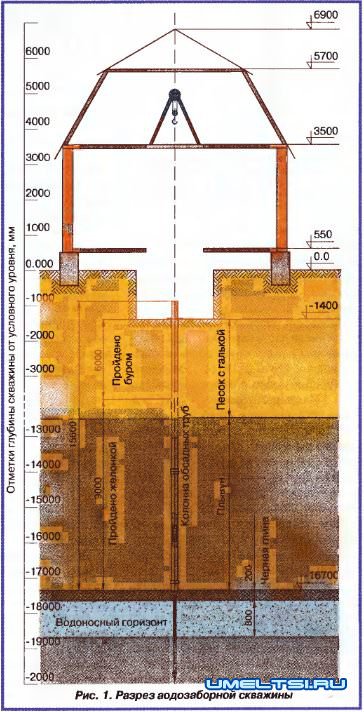 Водозаборная скважина (рис. 1) представляет собой конструкцию из колонны обсадных труб, насоса и водоприёмной части с фильтром.