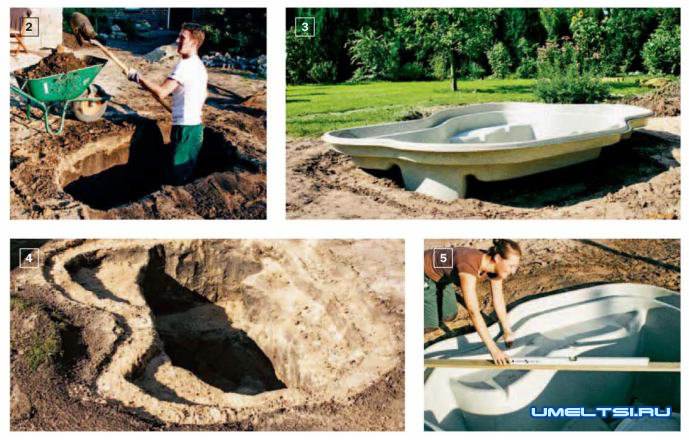 5. Пластиковую ёмкость опускают в котлован и на треть заливают водой. Положение чаши тщательно выравнивают.