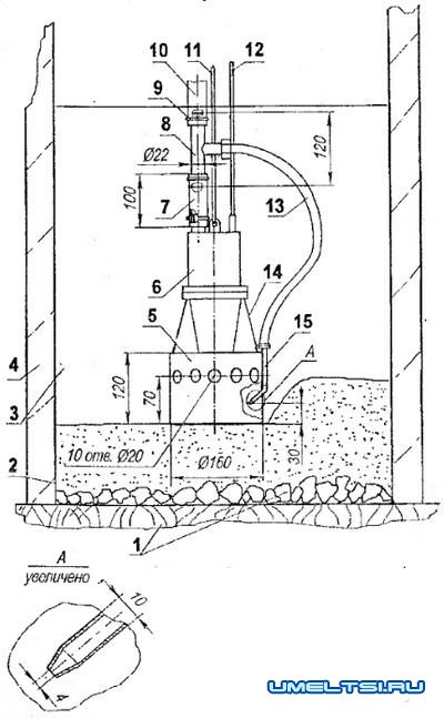 1 - дно колодца (глина и каменная наброска); 2 - наносной слой (ил); 3 -вода; 4 - стенки колодца (железобетон); 5 - колокол (банка из-под краски); 6 - бытовой глубинный вибрационный насос «Родник»; 7 - виброгаситель (отрезок шланга); 8 - тройник (труба "Л"); 9 - хомут (проволочная скрутка, по потребности); 10 - напорный водоотводящий рукав (резиновый шланг); 11 - подвесной трос; 12 - кабель электропитания насоса; 13 -обратный рукав (резиновый шланг); 14 - растяжка (трос, по потребности); 15 - сопло (медная трубка диаметром 10).