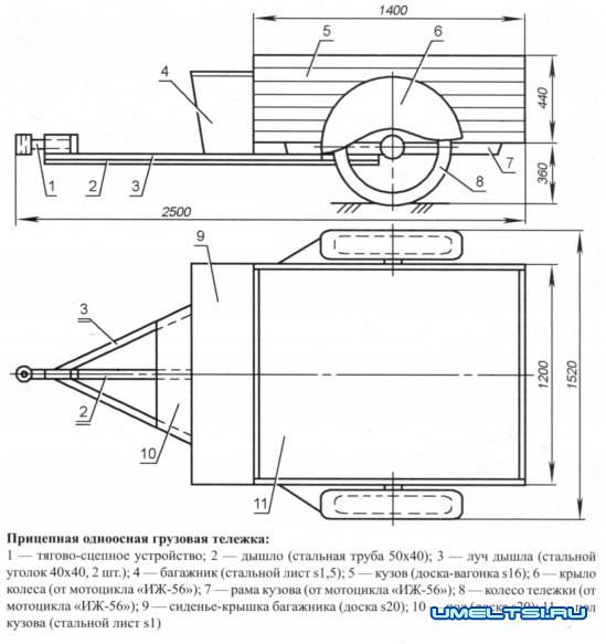 Поскольку мотоблок сразу задумывался ещё и как мототягач, то для него изготовил прицепную грузовую одноосную тележку с кузовом грузоподъёмностью до полутонны и двухместным сиденьем. Сделать мягкий диван со спинкой тоже не составляло большого труда, но тогда нельзя было бы перевозить длинномерные грузы, а иногда приходится транспортировать брёвна длиной до шести метров. Впрочем, и спинку нетрудно сделать съёмной. Дышло прицепа — из прямоугольной трубы сечением 50x40 мм с 2,5 мм стенками. Оно подкреплено ещё двумя подкосами из равнополочного уголка №4.