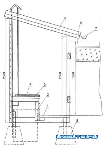 1 — пол; 2 — вертикальная стена стульчака; 3 — верхняя крышка стульчака; 4 — сиденье; 5 — кровля; 6 — дверь с окном; 7 — жолоб водостока; 8 — столбы фундамента, арматура крепления