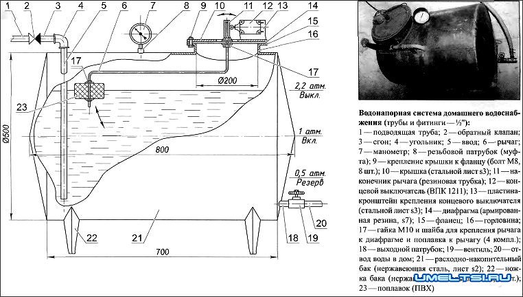 В боковой стенке бака, недалеко от его низа врезан и приварен выходной патрубок-штуцер, к которому через вентиль подсоединена отводная труба, через которую вода поставляется в дом и другие хозяйственные помещения. Условный проход трубы, патрубка и вентиля —1/2".