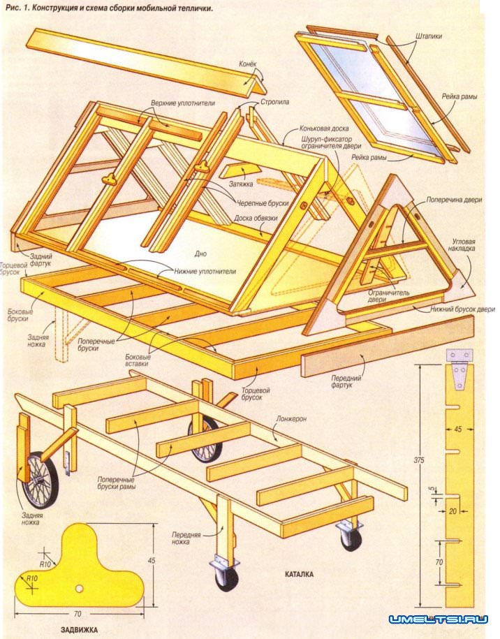 Конструктивно мобильная тепличка состоит из каталки на четырёх колёсах, опорной рамы и собственно двускатной теплички с фанерным дном.