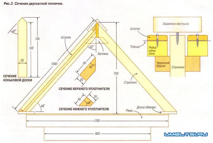 По краям фанерного дна прикреплены две доски — обвязка, в которые упираются стропильные ноги, вверху объединённые коньковой доской. Промежуточные стропила с черепными брусками, как и крайние, служат опорой для съёмных оконных рам. По желанию можна все рамы остеклить, но для меньшего веса и своей же безопасности от разбитых стекол, все же более приемлемо будет пленка.
