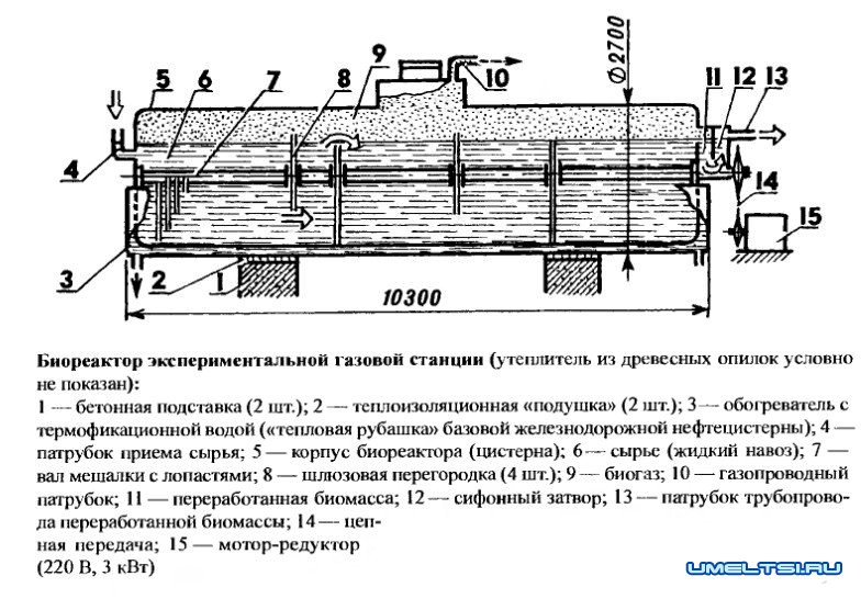 1 Соответственно фазам протекания биохимических процессов анаэробной обработки — гидролизной (ионный обмен между различными веществами и водой), ацидофильной (заквашивание особыми бактериями) и метаногенной (метан образуется при гниении органических веществ без доступа воздуха) — полость биореактора разделена шлюзовыми перегородками на три секции. По продольной оси смонтирован вал механической мешалки с лопастями из стальных уголков, расположенными по винтовой линии. Емкость цистерны 60 м3, полезная вместимость—50 м3. Температура анаэробной обработки 35—37 °С. Терморегулирование, то есть подача теплоносителя (воды), автоматизировано. Проектная доза суточной загрузки навоза —2,5 м3, проектный выход биогаза 50—60 м3/сут.