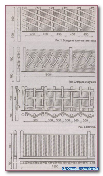 Существует множество вариантов дачных оград. Но любая из них состоит из несущих элементов и обрешетки. Несущие конструкции - это столбы и прикрепляемые к ним слеги, прожилины, рамки, проволока и т.п. Обрешетку выполняют из реек, досок, круглого штакетника, жердей, горбыля, ивняка, хвороста, а также из кирпича, бетона, металла. На рисунках 1 -4 показаны различные виды дачных ограждений. Конкретный вариант хозяин дачи выбирает, исходя из своего эстетического вкуса и финансовых возможностей.