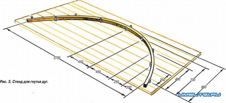 Для изгибания дуг нужен технологический стенд (рис. 3). Его сбивают из досок толщиной 20-30 мм и длиной около 3 м. Доски в щите должны плотно прилегать друг к другу. Важно, чтобы реперные точки (места крепления ограничителей) не попали в щели между досок. На щите вычерчивают дугу в натуральную величину. Ограничителями при изгибании планок служат гвозди 04,2x100 мм, забитые с двух сторон от контура дуги.