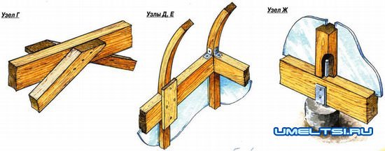На верхних поперечных брусьях крепят подконьковые стойки. Примеряют по месту, запиливают под нужным углом их концы и крепят подконьковые распорки между серединой конькового бруса и подконьковыми стойками. Затем устанавливают и крепят дуги (полудуги) арочной крыши, прибивая их в трёх точках: вверху — к коньковому брусу, внизу — к стойкам с накладками. Крайние дуги дополнительно крепят к стойкам фронтонов.