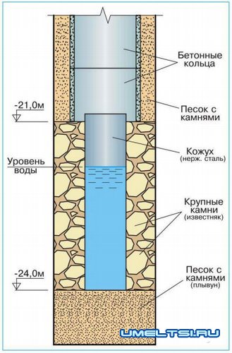 • необходимо углублять колодец, но на дне известковые камни, сложенные плотными и прочными слоями. Камни надо колоть и поднимать — работа крайне тяжёлая, если вообще выполнимая.