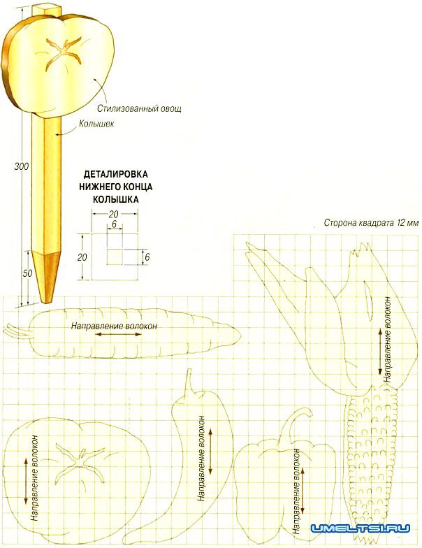 На рисунке не показано расположение шурупов крепления, так как они разные для каждого овоща. На задней стороне каждого овоща просверлите направляющее отверстие под шуруп ∅4x32 мм, а в колышке просверлите отверстие ∅4 мм и раззенкуйте его.
