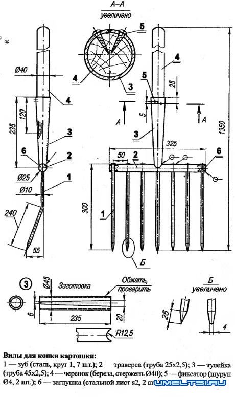 Внешне вилы мало отличаются от стандартных. Вся их специфика — в исполнении деталей, номенклатура которых такья же, как у промышленных образцов.Зубья вил выполнены из стального круглого стержня диаметром 10 мм. Примерно посередине они изогнуты, а нижние концы их заточены. Количество зубьев доведено до семи (в заводских их три-четыре) и распределены они равномерно на траверсе с таким расчетом, чтобы даже мелки:! картофель не проскальзывал между ними.