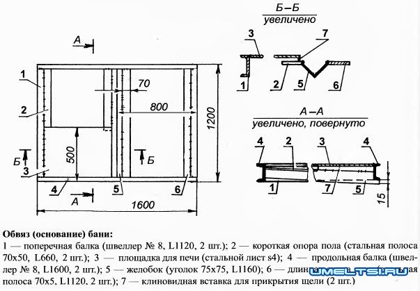 Постройка бесфундаментная (монтируется на месте на 6 кирпичах: 4 штуки устанавливаются по углам и два — по середине длины — около сливного желобка), а поэтому необходимо жесткое и прочное основание-обвяз. Обвяз (балки и поперечины) выполнен из стального швеллера № 8 (с полками по 40 мм и стенкой высотой 80 мм) в форме прямоугольника со сторонами 1200 и 1600 мм.
