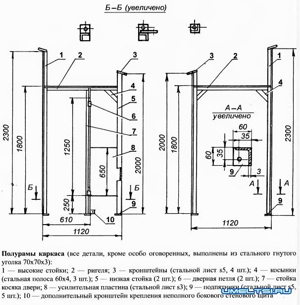 В одну из полурам вварена еще одна короткая дополнительная стойка — дверной косяк. Высота косяка — до ригеля, а потому последний служит еще и притолокой. Роль второго косяка выполняет угловая высокая стойка. К короткой стойке-косяку болтами Мб прикрепляются полупетли назесных шарниров двери.