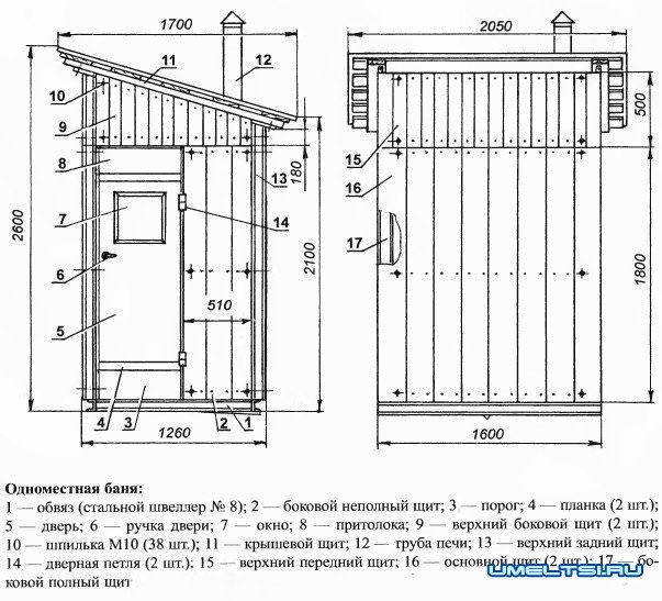 Эту идею я принял как руководство к действию и спроектировал и построил свою мини-парилку. Рассчитана она на одного человека, у нее нет даже предбанника-раздевалки. И хотя в ней по сравнению с обычной баней тесновато, но свои прямые функции парилка выполняет отменно. Еще одно ее достоинство — строение складное (разборное) и перевозить его можно даже в прицепе легкового автомобиля