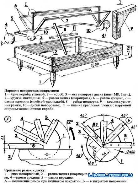 По размерам получившегося короба заготавливают четыре П-образные рамки, концы которых крепят к двум фанерным дискам (последние следует проолифить и покрыть масляной краской, чтобы не боялись влаги). Диски устанавливают на короб-основание по его продольной оси шарнирно. Это дает возможность приподнимать один край каркаса, получая доступ к грядке. По завершении работы каркас, поворачивая на осях, снова опускают на короб, надежно прикрывая грядку.