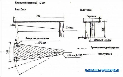 • Кронштейны (ступени) я изготовил из листовой стали толщиной 5 мм, приварив их к патрубкам из труб диаметром 60 мм и длиной 208 мм.