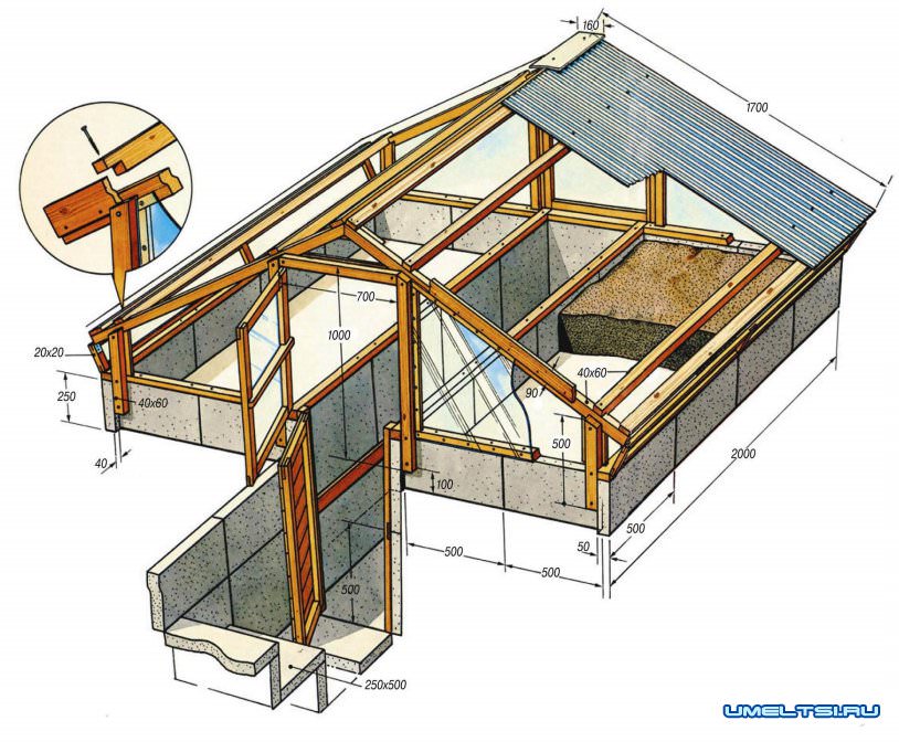 Основание теплички-погребка выложено из бетонных плит размерами 250x500x50 мм на цементном растворе. Силовой каркас — из бруса сечением 40x60 мм. Основные размеры и узлы соединения деталей показаны на рисунке.