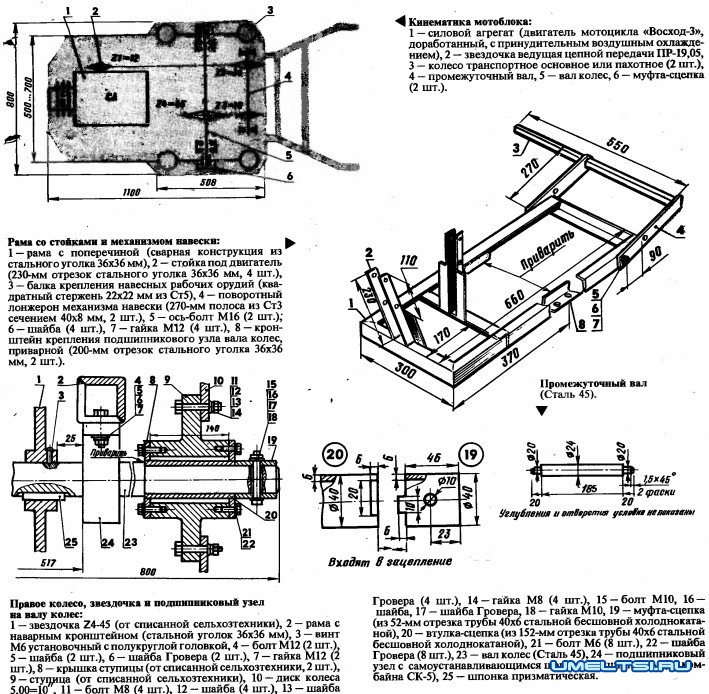 Остальные элементы конструкции мотоблока, их изготовление и крепленая, думается, затруднений ни у кого не вызовут. Если, разумеется, ориентироваться на представленные иллюстрации.
