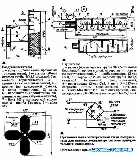 Для вентилятора как нельзя лучше подходит малогабаритный электродвигатель типа МЭ14-А12/15 (ГОСТ3940-84). Но можно использовать и любой другой, расчитанный на питание от сети постоянного тока напряжением 12В. В нашем случав он, как уже отмечалось, работает от самодельного выпрямителя (см. схему), подключенного непосредственно к генератору,мотоблока. Диоды с конденсатором вмонтированы в пластмассовый корпус и размещены вместе с самим вентилятором на специальном кронштейне.