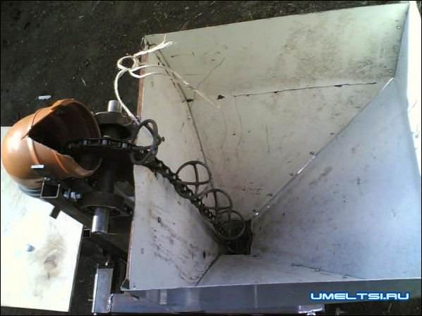 Черпаки (захват картофеля из бункера) изготовлены из толстой проволоки 6 мм, согнуты в кольца диаметром 50 миллиметров. Делаем таким образом:на трубу аккуратно наматывается проволока после чего делается пара разрезов, чтобы получился зазор. Зазоры должны быть меньшими ширины цепи, тогда не возникнет проблем с их сваркой. Привариваем элементы на равных расстояниях к цепи. Расстояние между черпаками 16см. Необходимо варить только полуавтоматом, что бы не повредить ролики и звенья на цепи от перегрева. Внутри черпаков привариваем крестик из той же проволоки, что бы по две не брал и мелкая не вываливалась. (см. фото картофелесажалки)