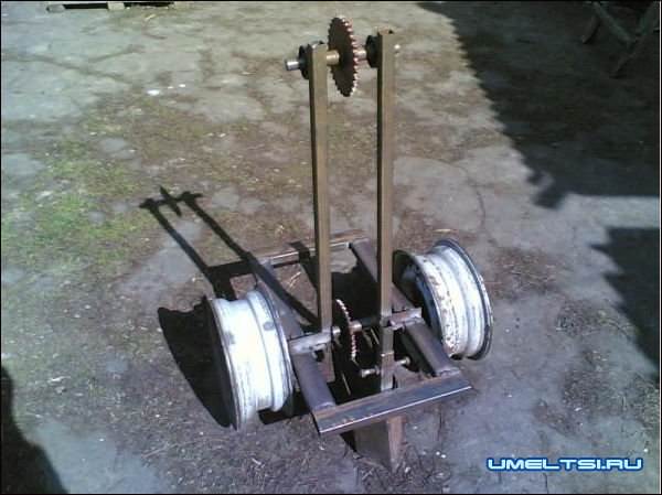 Пришлось придумать вторую пару колес. После первых испытаний (до колес) все устроило но выезжая с гона она продолжала кидать картофель, ведь гидравлики у мотоблока нет что бы ее приподнять. Механизм вывода из зацепления усложняло конструкцию да и делать было неудобно.