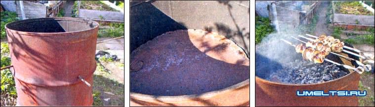 Из старой бочки вырезается дно, и она ставится на кирпичи. (Дно можно и оставить, тяга все равно будет достаточной.) На расстоянии около 25 см от верхнего края бочки по окружности сверлятся на равном расстоянии друг от друга 4 отверстия диаметром 12-13 мм. В старой бочке это можно сделать при помощи дрели или пробойника. Из арматурного прутка ножовкой или болгаркой нарезаем отрезки на 50-100 мм длиннее диаметра бочки и вставляем их крест-накрест. Сверху на прутки кладем дно бочки или любой лист железа. Между контурами дна и стенками бочки у нас получается небольшой зазор, который обеспечит хорошую тягу. Дрова сжигаются на дне, а шампуры кладутся на край бочки. Для устойчивости шампуров на один край бочки можно положить металлический уголок. Эта конструкция легко разбирается, и бочку можно использовать по другому назначению - например, для сжигания крупного мусора.