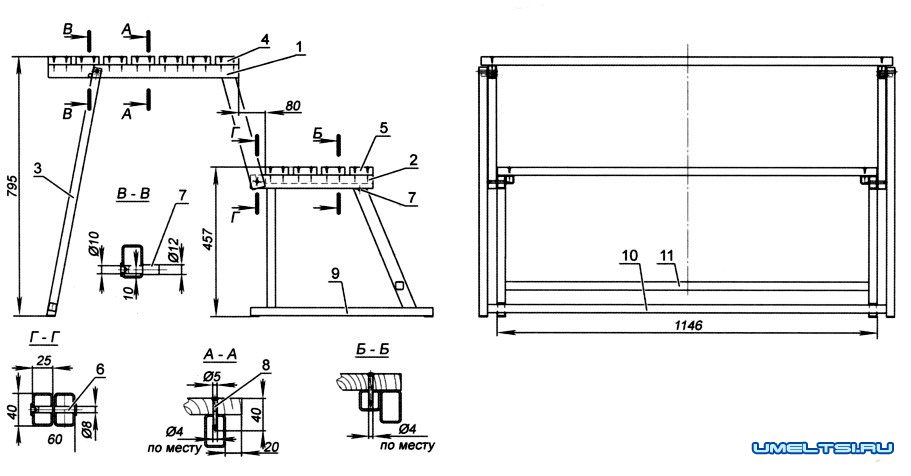 1 - Г-образный кронштейн каркаса стола (2 шт.); 2 - каркас скамейки; 3 - опора стола; 4 - обрешётка стола; 5 - обрешётка скамейки; 6 - ось (2 шт.); 7 - упор (2 шт.); 8 - саморезы по металлу (44 шт.); 9 - опорная поперечина скамейки (2 шт.); 10 - проножка стола; 11 - проножка скамейки