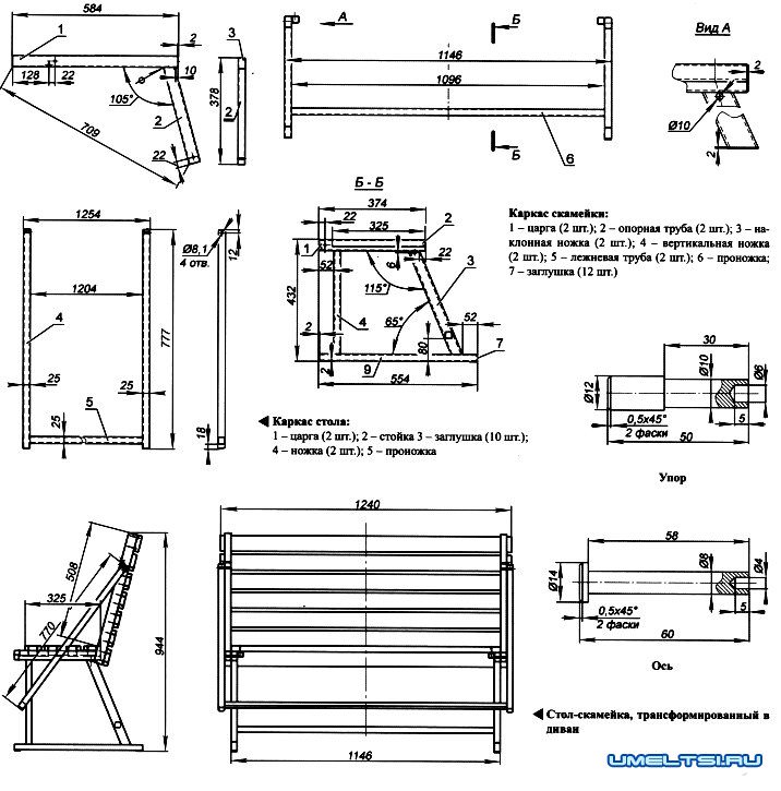 - Заготовить детали скамейки из труб сечением 25*40 мм и 25*25 мм и сварить правую и левую боковины каркаса скамейки; приварить торцевые заглушки; разметить и просверлить отверстия для шарниров и упоров; приварить соединяющую распорку.
