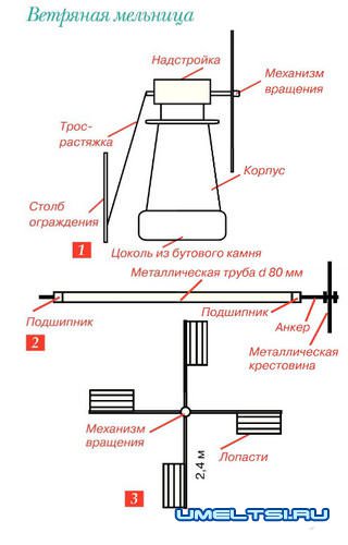 Из обрезков брусьев и оконных рам собрал каркас надстройки, который служит опорой механизма вращения. Надстройку расположил на площадке верхней платформы, консольный вынос которой — примерно 60 см . Так крестовина с лопастями при вращении не задевает корпус декоративной мельницы. Все крепления конструкций выполнил гвоздями, шурупами, хомутами, болтами. Крышу надстройки выполнил двухскатной и накрыл ондулином.