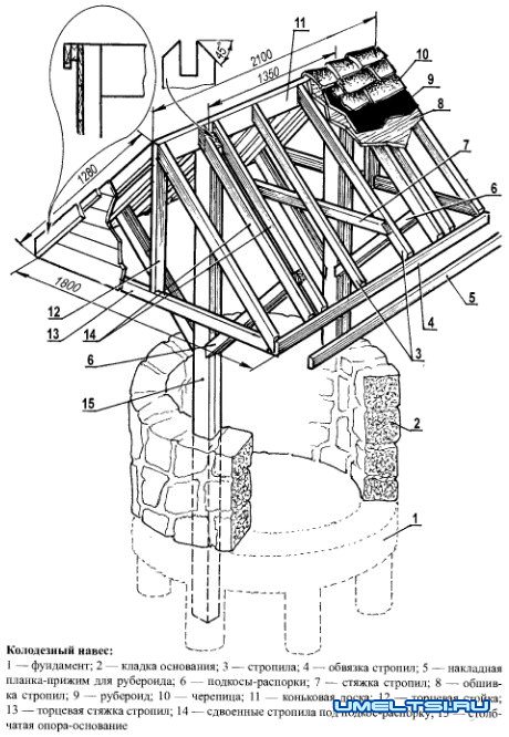 Предлагаемый вариант крышевой надстройки специалисты называют «датский колодец». Его основание представляет собой кольцо из крупных неотесанных камней, скрепленных цементным раствором. Внутренний диаметр его — 1,2 м, а наружный — 1,5 м. Такая массивная каменная кладка требует солидного фундамента. Им могут служить уже имеющиеся бетонные кольца отрытого колодца или выполненные специально, закладываемые на глубину промерзания грунта зимой для данной местности. С целью экономии материала такой фундамент имеет не сплошную кольцевую форму, а выполнен в виде ряда бетонных столбов, впоследствии соединяющихся в кольцо лишь в верхней части.
