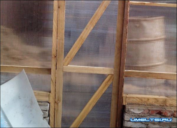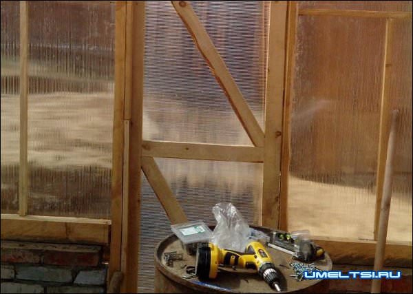 Стены теплицы сделал из поликарбоната прикрепив его саморезами к брусьям.