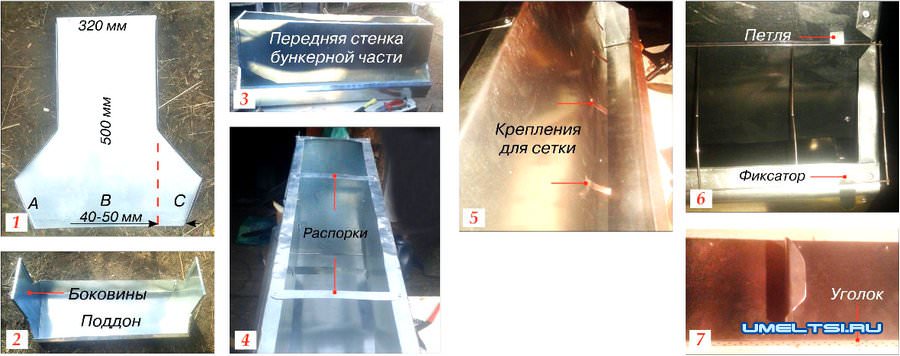 Конструкция вмещает порядка 1,5 мешка корма, и, чтобы зерно не распирало бункерные стенки, укрепил их. Вырезал полосы шириной 20 мм из оцинковки, согнул их края под углом 90 град, и приклепал изнутри к изделию. Такие же полосы и уголки установил на верхнюю часть кормушки (фото 4)