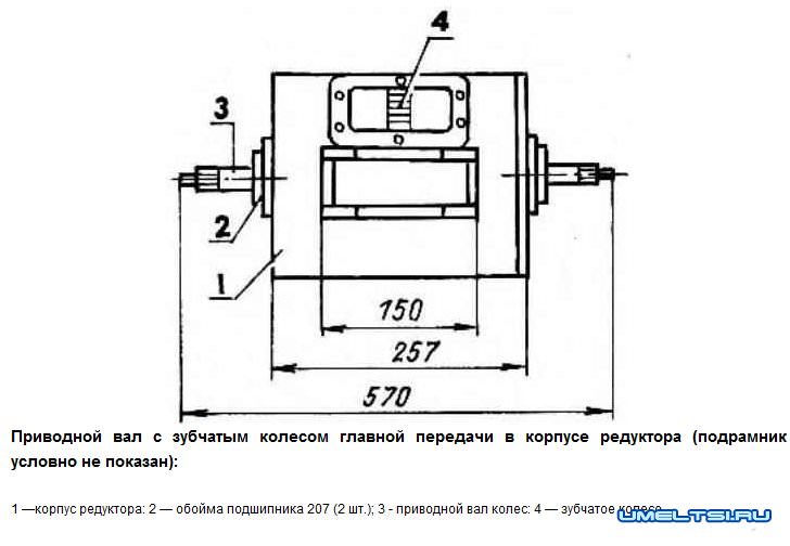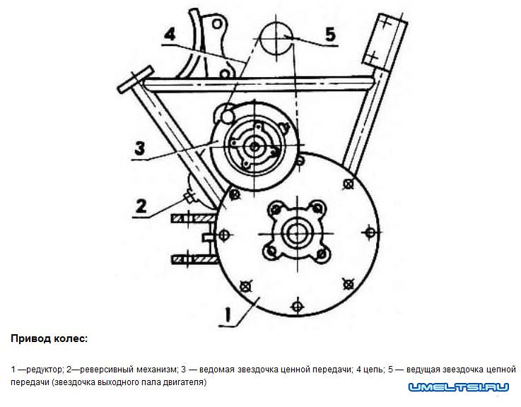 Вращательное движение от выходного вала коробки передач двигателя через цепную передачу передается на звездочку, насаженную на вал реверса, а от него — через зубчатую пару на вал редуктора и дальше сразу на оба колеса.