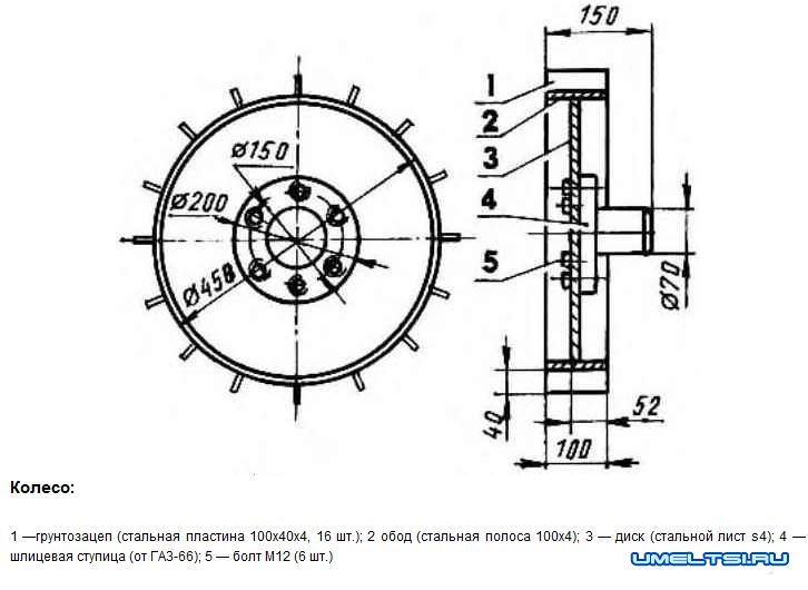 Колеса мотоблока, используемые для обработки земли на усадьбе, — самодельные, полностью стальные и очень простые: к диску диаметром 450 мм приварен обод, а к ободу — по всей окружности через равные промежутки — 16 грунтозацепов. Все детали колеса выполнены из одного и того же материала — 4-м м стального листа.
