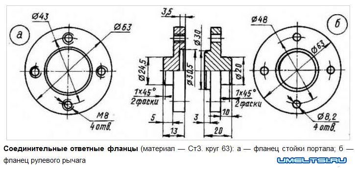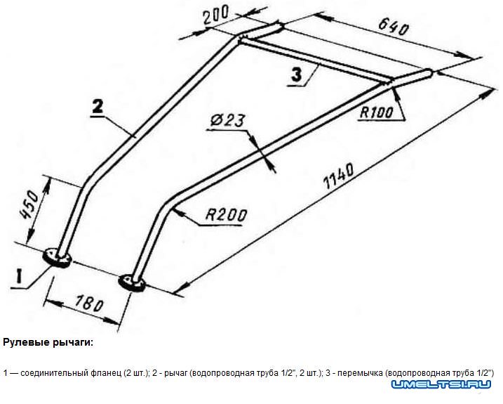 Рычаги управления мотоблоком изготовлены из стальных труб наружным диаметром 23 мм. Верхние концы рычагов около рукояток соединены между собой поперечиной из такой же трубы. К нижним концам рычагов приварены фланцы — «ответные» детали тех, что на стойках портала на корпусе редуктора. В каждом фланце просверлены по четыре отверстия диаметром 8,2 мм, через которые болтами М8 с пружинными шайбами (чаще называемыми технарями «гроверными» — по имени их изобретателя Гровера) рычаги и прикрепляются к порталу основания.