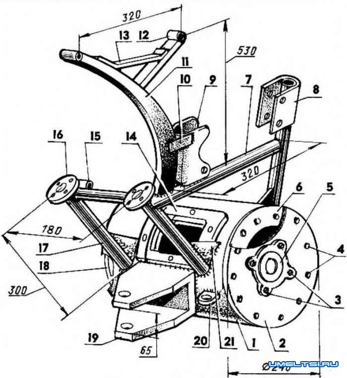 Основание самодельного мотоблока: 1 — корпус редуктора (от автомобиля ЗИЛ-130); 2 — съемный фланец корпуса редуктора (СтЗ, лист s7); 3 — винты М6 (8 шт.); 4 — винты М8 (12 шт.); 5 — подшипниковый узел: подшипник в обойме с крышкой и сальником (2 компл.); 6 — кольцо для крепления съемного фланца (СтЗ, лист s7); 7 — подрамник двигателя (стальная труба 3/4"); 8 — передний кронштейн крепления двигателя (СтЗ, лист s2); 9 — задний кронштейн крепления двигателя (СтЗ, лист s2); 10 — накладка (СтЗ, лист s2, 2 шт.); 11 — стойка бензобака; 12 — крепежная втулка (труба 1/4", 2 шт.); 13 — перемычка (СтЗ, лист s2); 14 — проставка-фланец крепления картера реверса (сталь, лист s12); 15 — втулка крепления рукоятки реверса (труба 1/4"); 16 — фланец крепления рулевых рычагов (2 шт.); 17 — портал рулевых рычагов (стальная труба 3/4"); 18 — несъемный фланец корпуса редуктора (СтЗ, лист s7); 19 — кронштейн навески почвообрабатывающих орудий; 20 — ушко крепления регулировочной тяги плуга; 21 — косынка (СтЗ, лист s2, 3 шт.)