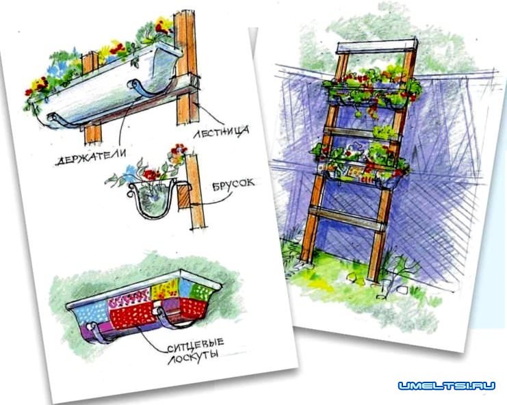 Уступы этой лестницы — надежные «постаменты» для растений в контейнерах, даже крупных. А чтобы забраться вверх, просто уберите емкости.