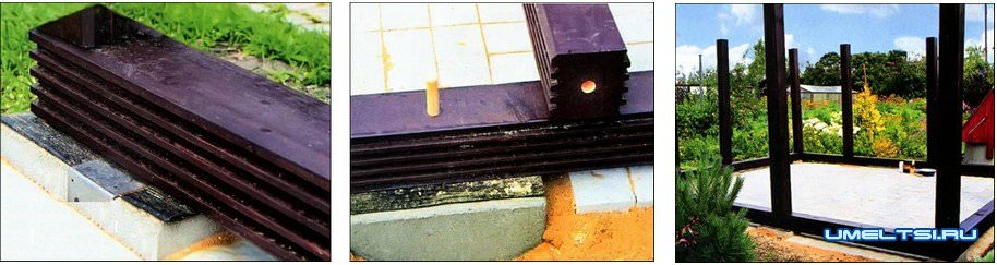 1. На столбчатый фундамент уложили обрезанные по размеру беседки балки нижней обвязки из профилированного бруса. Для прочной фиксации скрепили их с фундаментными блоками металлическими уголками.