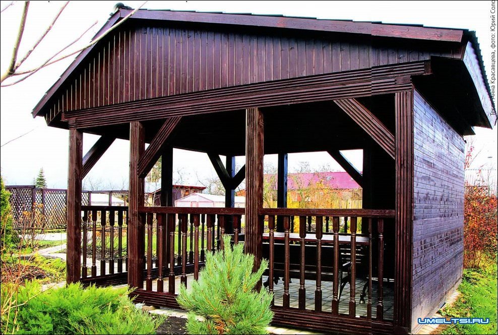 Просто изумительно смотрится полуоткрытая беседка с перголой вместо сплошной крыши, увитая плющом или плетистыми розами. Такое строение навевает мысли о южных странах и летнем отдыхе. Защиту от дождя решетчатая крыша не обеспечит, зато спасет от палящего солнца.
