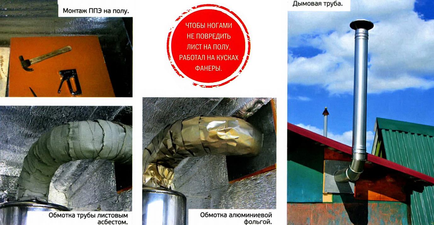 Дымовая труба внутри душевой находится слишком близко к потолку, поэтому нужна теплоизоляция. Трубу я обмотал листовым асбестом: смачивал его водой для пластичности и крепил проволокой. Открытый асбест оставлять нельзя, поэтому поверх обмотал трубу ещё лентой из алюминиевой фольги.