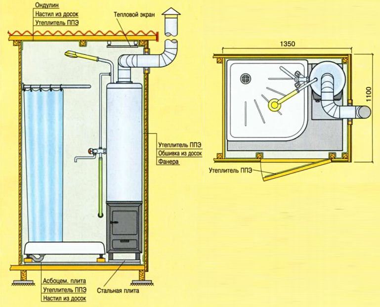 Подсказка, как это часто бывает, пришла от соседей. Они использовали дровяную колонку, которая, пока грелась вода, успевала прогреть и небольшую душевую. Я решил устроить себе такой же душ, оборудовав старенький хозблок, где была старая душевая. При этом надо было уложиться в размер 135 x 110 см. Дровяная колонка была куплена несколько лет назад и дожидалась своей очереди. Специально для неё сделал напорный водопровод от скважины.