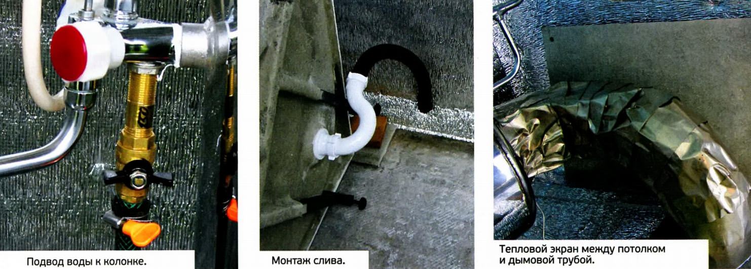 Недостатком оказались брызги воды от душа в сторону колонки. Мне пока не удалось придумать хороший щиток или фартук для изоляции. Другой недостаток-отверстие слива из колонки оказалось неудобно расположенным. Не получалось приспособить шланг, поэтому вся вода сливается на пол. Для обеспечения слива пришлось чуть наклонить кабину и отрегулировать положение поддона для гарантированного стока воды. Эта переделка пригодилась осенью, когда пришлось сливать воду из колонки. Кроме того, слив через сифон поддона оказался слабым, что приводило к засорам. Пришлось купить вантуз и поселить его в душевой.
