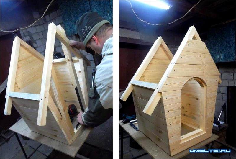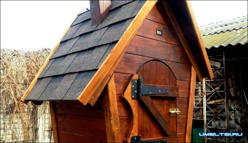 Создается дверной проем, после чего мастер переходит к процессу сооружения крыши, которая также обшивается доской. Навешивается дверь.