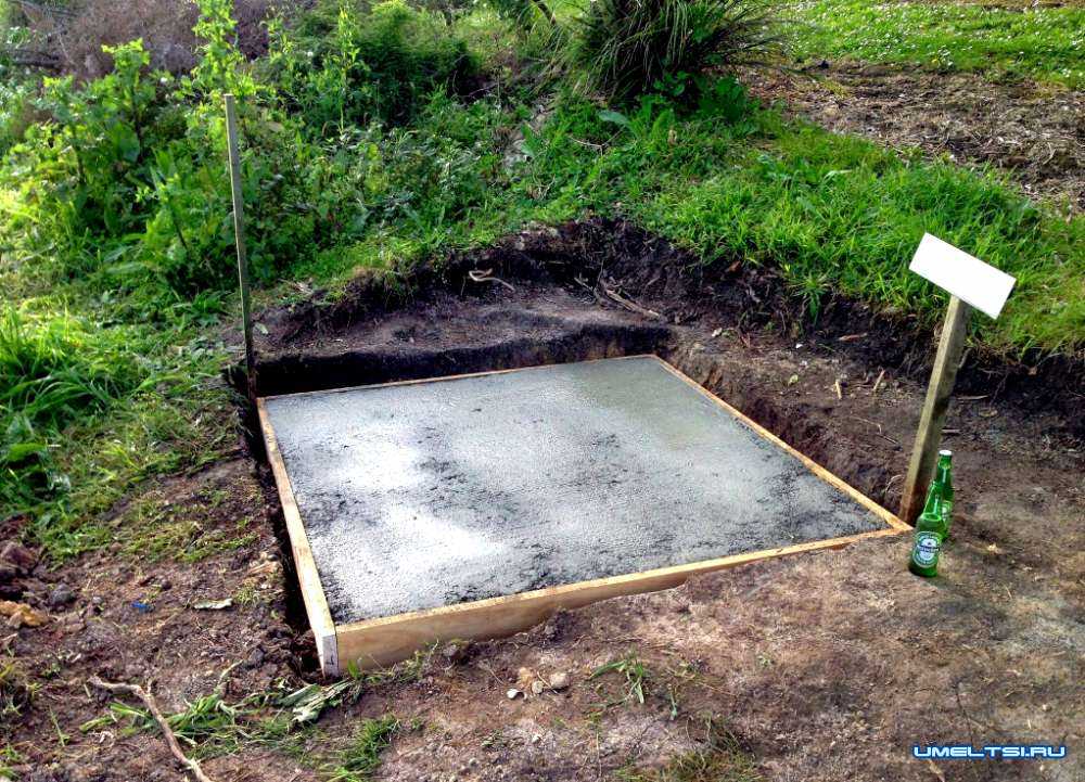 После заливки бетоном, который сделали из гранотсева и цемента с расчета 3:1, ровняем его по уровню в горизонтальной плоскости.